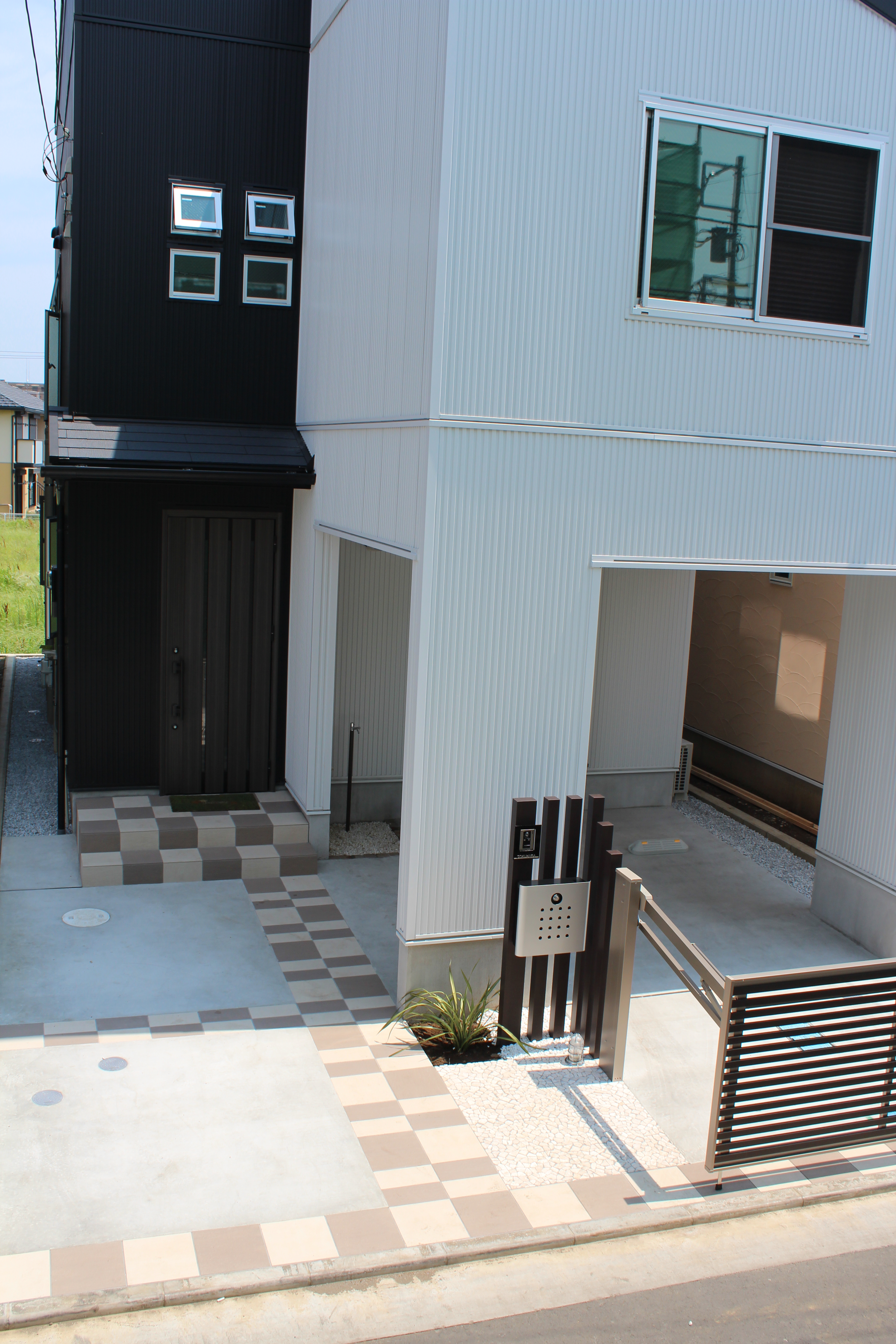 黒と白の戸建住宅に、2色のタイルを使ったアプローチがカッコイイ建物をより魅力的にみせます。