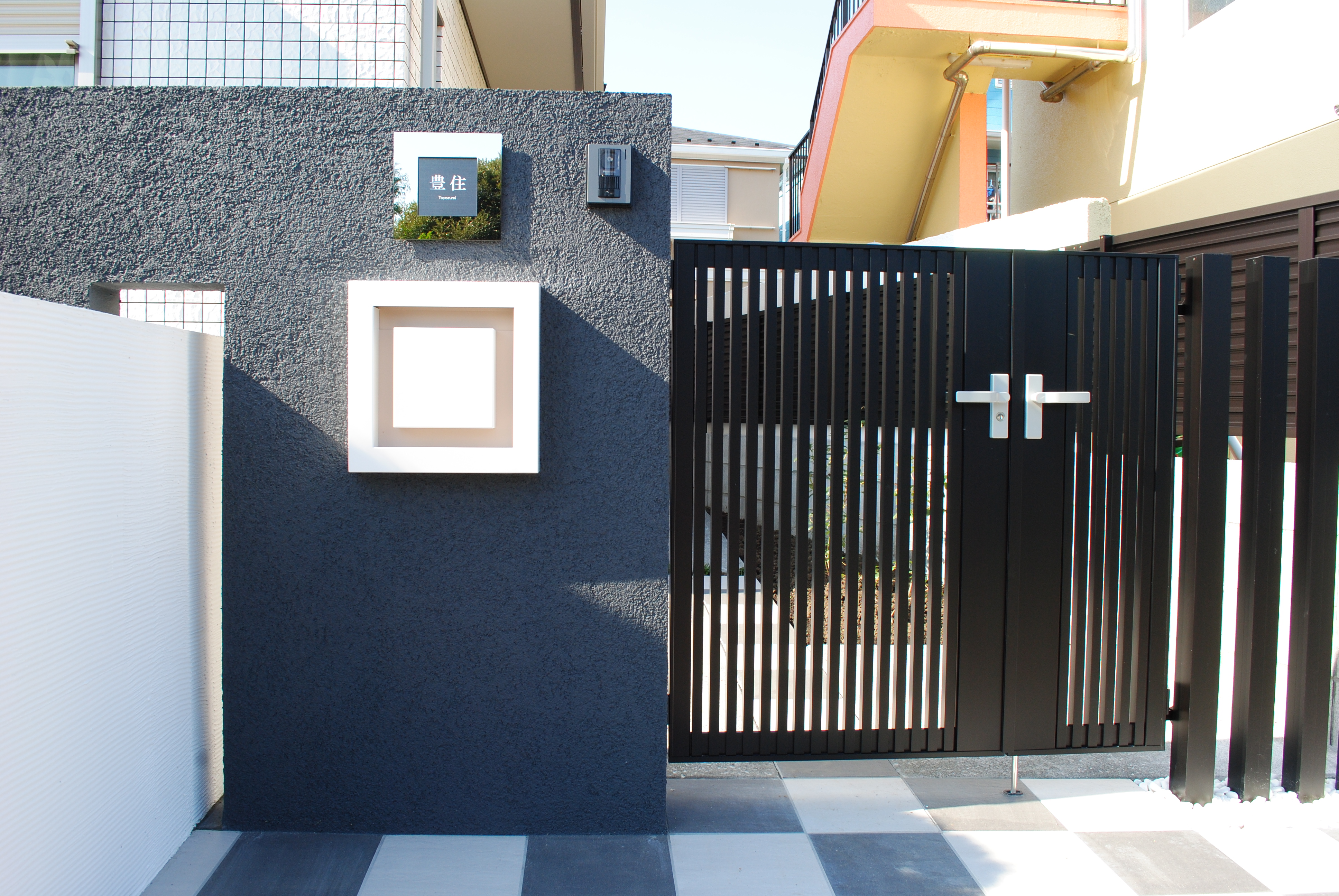 黒い門袖の一部を抜いて、白い袖壁を通した独特なデザイン。