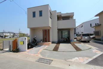 T字路の角地に立地する、オープンな駐車場の施工例。
