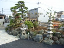 景石や飛び石で和の印象。景石の両サイドの植物はオモト。漢字で万年青と書き、字の通り一年通じて青い事に由来し、日本古来よりとても縁起の良い植物と言われています。