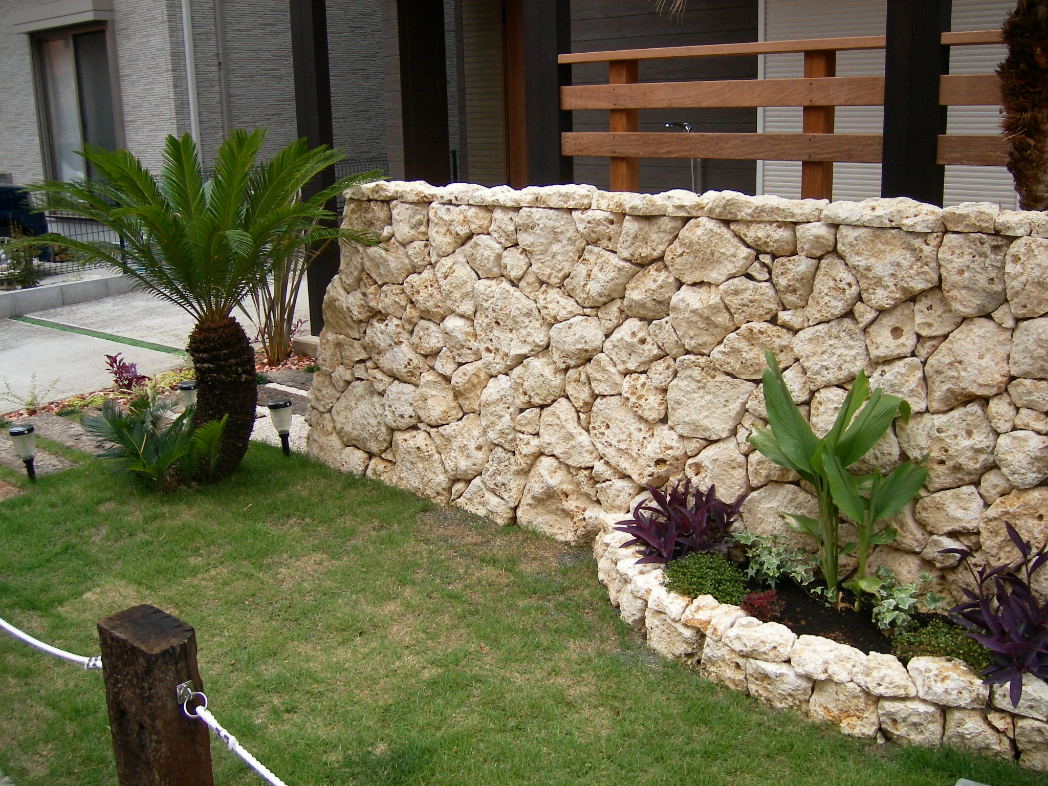 リゾート風の石積み腰壁とウッドデッキのお庭 平塚市