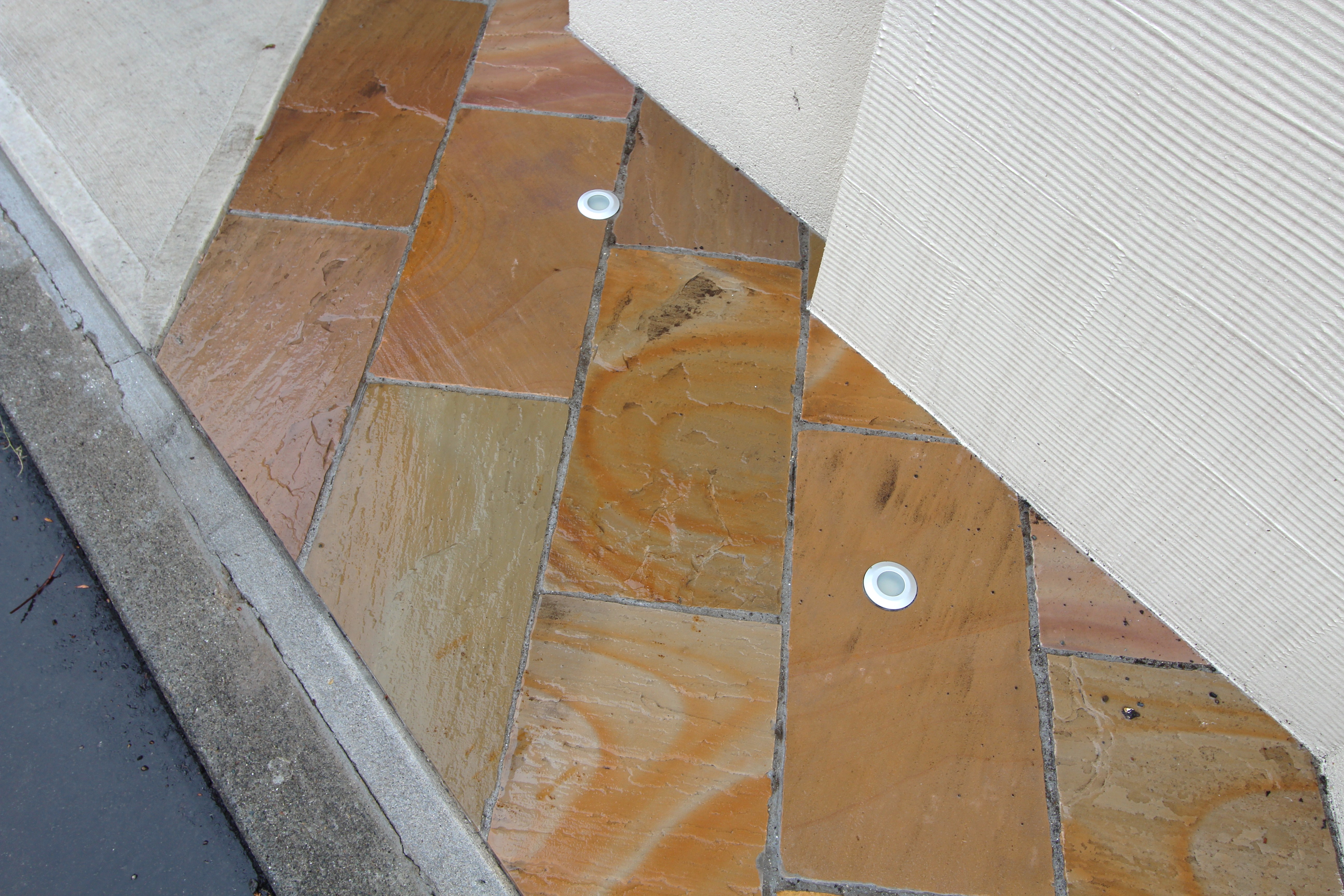 夜には自然石に埋め込まれた照明で、ライトアップも楽しめます。