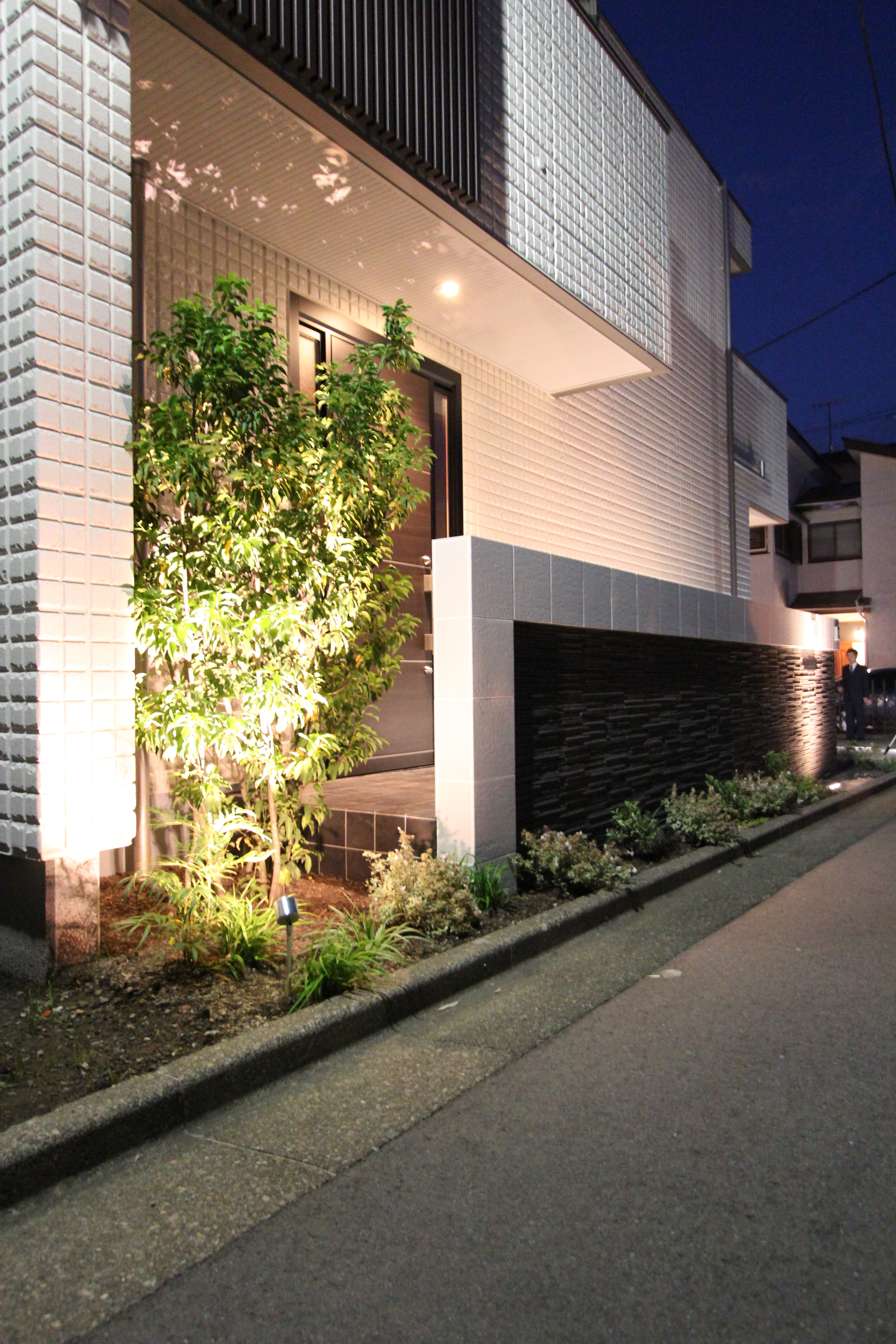 門袖の周りに照明を取り入れたことで、夜間もおしゃれで、落ち着いて歩けるアプローチになっています。