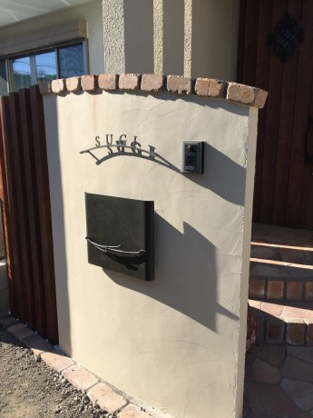 塗り壁の門袖に、ブラックの表札と