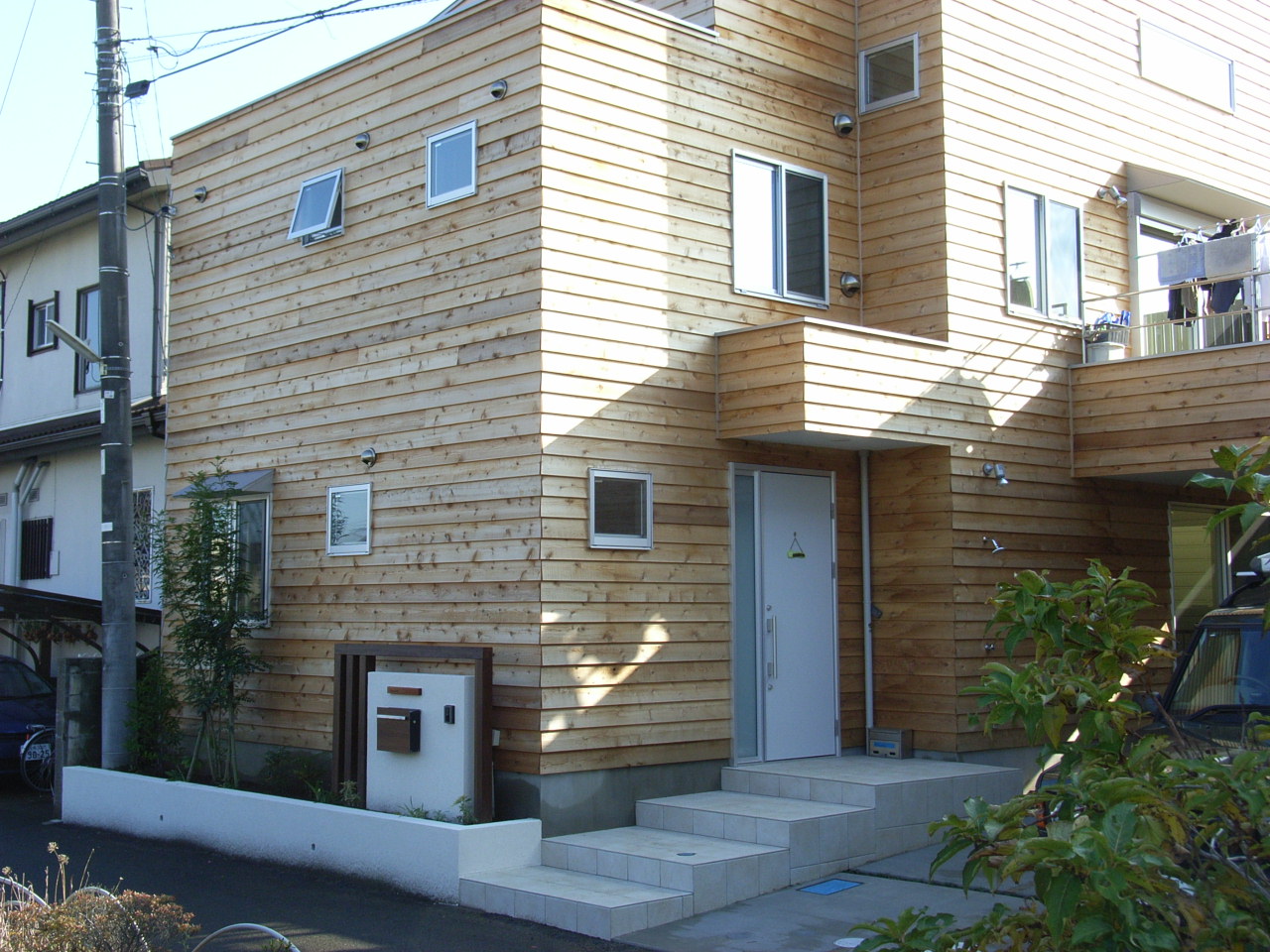 HOME > 外構施工事例 > 門まわり > 板張りの建物に合わせた木調門袖 平塚市