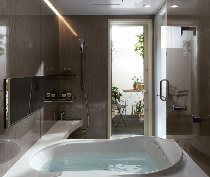 肩湯で少ない湯量でも全身浴のような入浴スタイル
