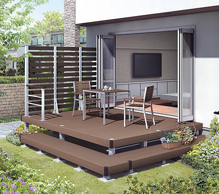 耐候性・耐久性にも優れ、メンテナンスが容易な樹脂デッキです。